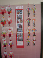 Da visita aos costureiros, a 12 de Junho, recontamos a lenda e separamos o veludo vermelho, o tecido às riscas e papeis de bolo rendilhados.A partir destes materiais, tendo as imagens do Livro "Bugiada"sempre por perto, tiramos a medida aos calções de Bugios, às calças e barretinas dos Mourisqueiros, colorimos parte do fato e acessórios e resultaram Bugios e Mourisqueiros que resolvemos expor no átrio da Escola.