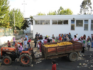 Assim foi!...Nem deu tempo de nos prepararmos! Quem tinha os lenços, aventais e chapéus, bem os usou mas, quem não os tinha na escola, improvisou um lenço com retalhinhos de pano que sempre há guardados na despensa. Por volta das 13h30m, chegou o Sr. Lindoro no seu tractor.O recreio estava quase seco!