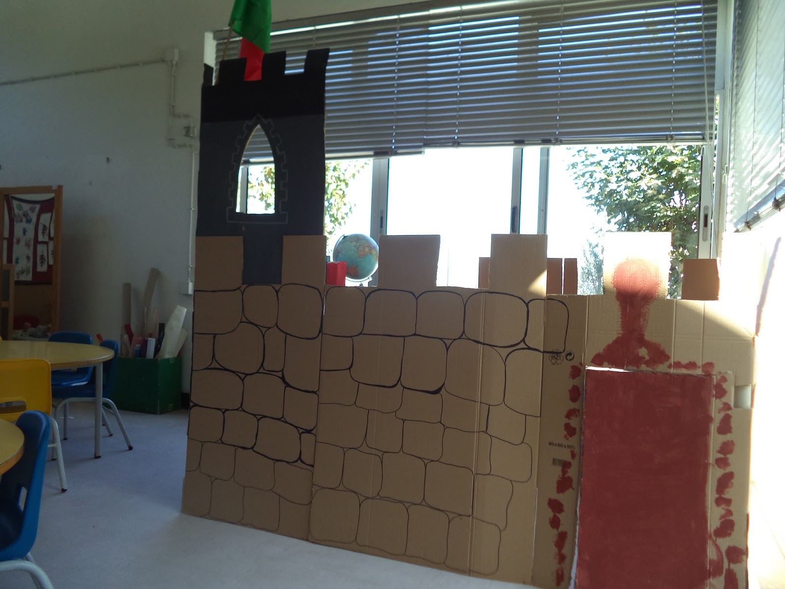 A 7 de outubro foi dia de nos entusiasmarmos por castelos. Vivemos num país onde estas fortificações se encontram em todo o território e com estilos muito variados. Para as crianças há uma certa magia com estas construções historicas...e os cavaleiros, reis , princesas e guardas são finguras que fascinam. Assim no âmbito deste dia algumas atividades foram lançadas. Fizeram-se castelinhos com caixas de leite e com caixas grandes fizemos um castelo onde agora funciona a nossa Biblioteca.E porque somos patriotas, "içamos" a bandeira portuguesa na torre desse castelo. Ah! também tivemos uma surpresa! chegou-nos através de um "rei" e de uma "princesa" um castelo para montar. E como é lindo!