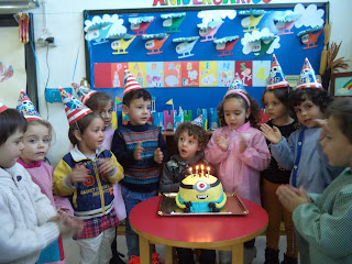 A 4 de março, mais um momento alegre de comemoração - o aniversário do Dinis. O bolo amarelinho e fofinho, era uma delícia! Assim completou 5 anos na companhia dos coleguinhas que cantaram os Parabéns com entusiasmo e prepararam o postal coletivo para lhe oferecer.
