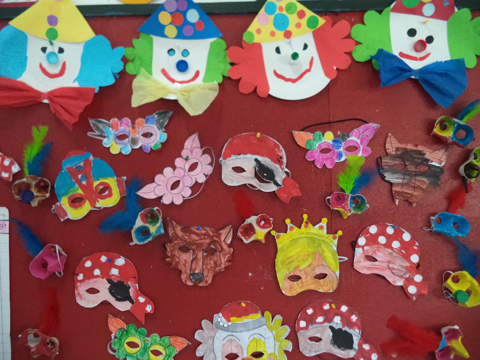 Muitas vezes a alegria é representada através de palhaços. Pois recorremos a eles para simbolizar a alegria do tempo de carnaval. Fizemos então palhaços com pratos de papel e  decoramos a porta da sala. Aprendemos músicas. Mas também fizemos máscaras e mascarilhas com moldes e com caixas de ovos.Hoje foi dia de nos fantasiarmos a gosto pessoal e, todos juntos, brincamos e dançamos muito lá na escola. Que bom!!!!!